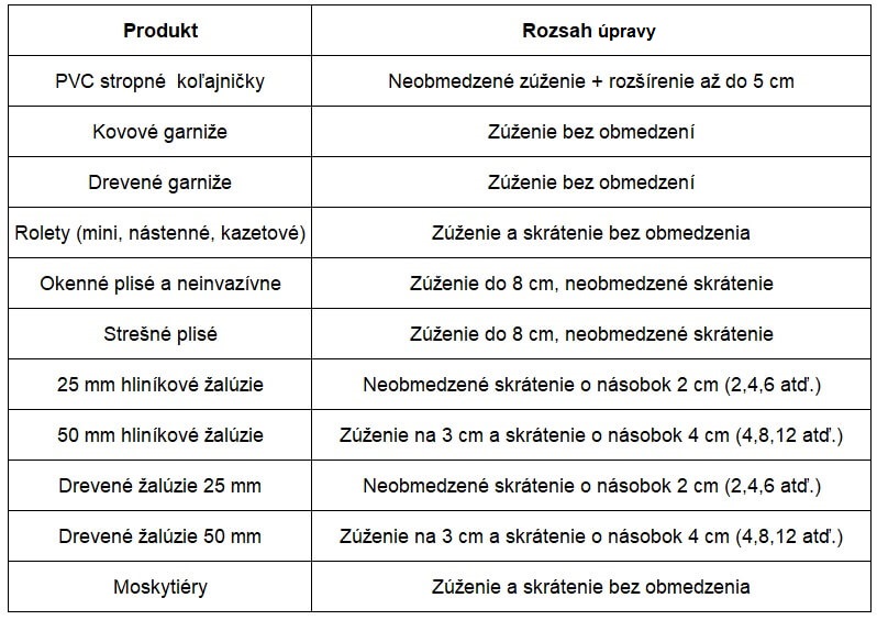 4. V rámci Garancie úpravy je zabezpečená zmena veľkosti produktu v súlade s vyššie uvedenou tabuľkou v situácii, kedy je nesprávna výška alebo šírka produktu v dôsledku chyby merania zo strany kupujúceho. Spôsob montáže produktu nemožno zmeniť a Garancia úpravy sa naň nevzťahuje.