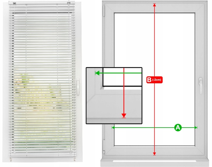 a) namontovanie žalúzií na strop: celková výška ''B'' je výška od stropu k miestu, kde je roleta rozložená (napr. k parapetu alebo podlahe)