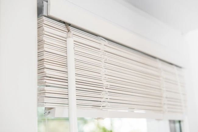 Na obrázku je mechanizmus žalúzie so zdvihnutými lamelami, záťažová lišta a odraz od steny / rámu okna.