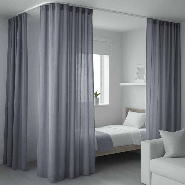 - Priečky a zásteny: flexibilná deliaca stena v obývačke alebo garsónke