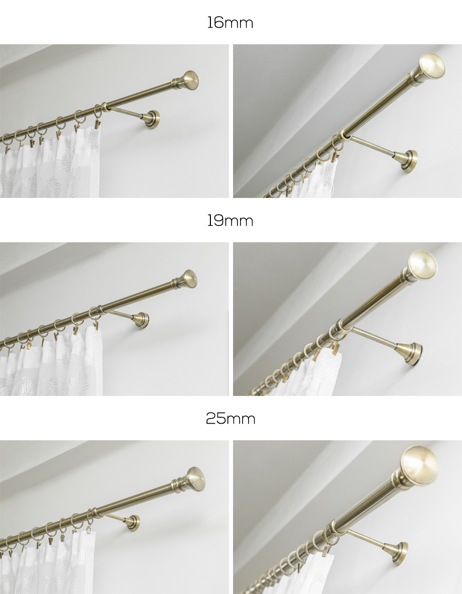- Tyč s priemerom 19 mm – Záclonové tyče do dĺžky 250 cm dodávame v celku a nad 250 cm v dvoch rovnakých častiach (napr. záclonová tyč 400 cm sa skladá z dvoch tyčí o dĺžke 200 cm)