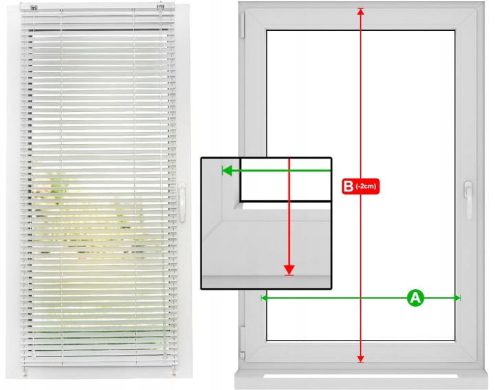 a) pripevnenie žalúzie k stropu: celková výška ''B'' je výška od stropu k miestu, kde je žalúzia rozložená (napr. k okennému parapetu alebo podlahe)