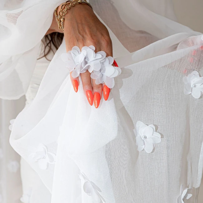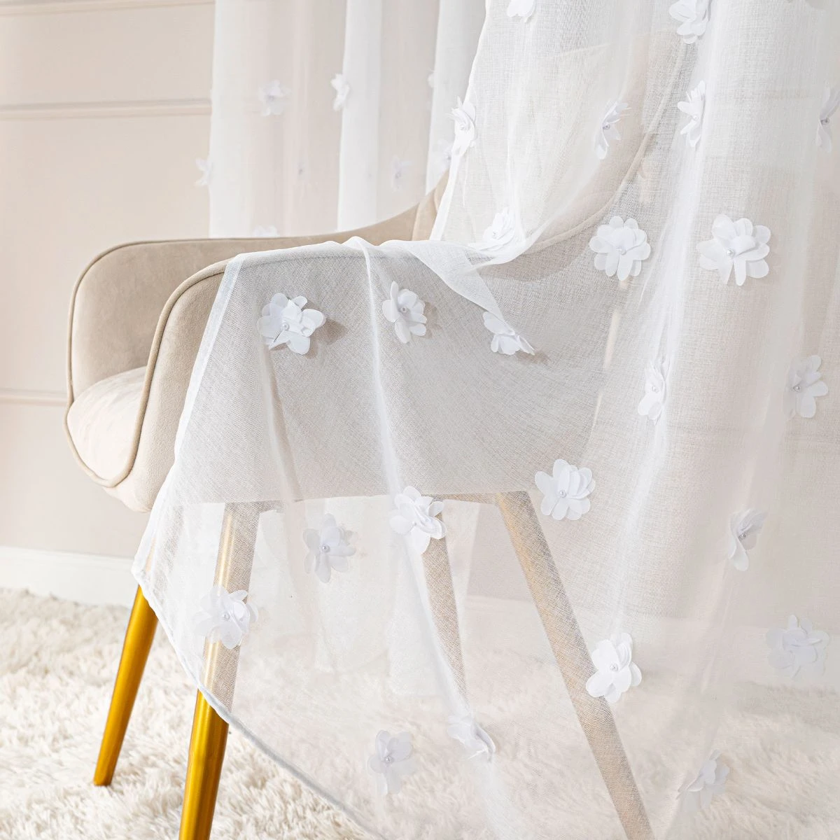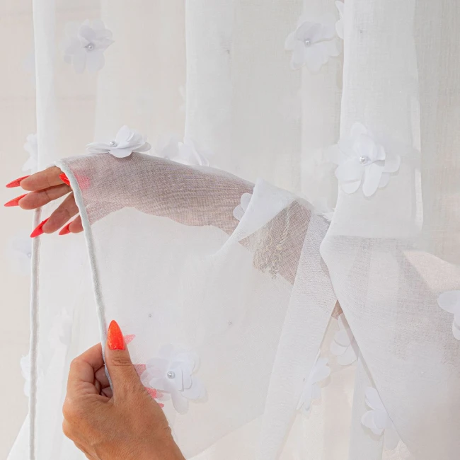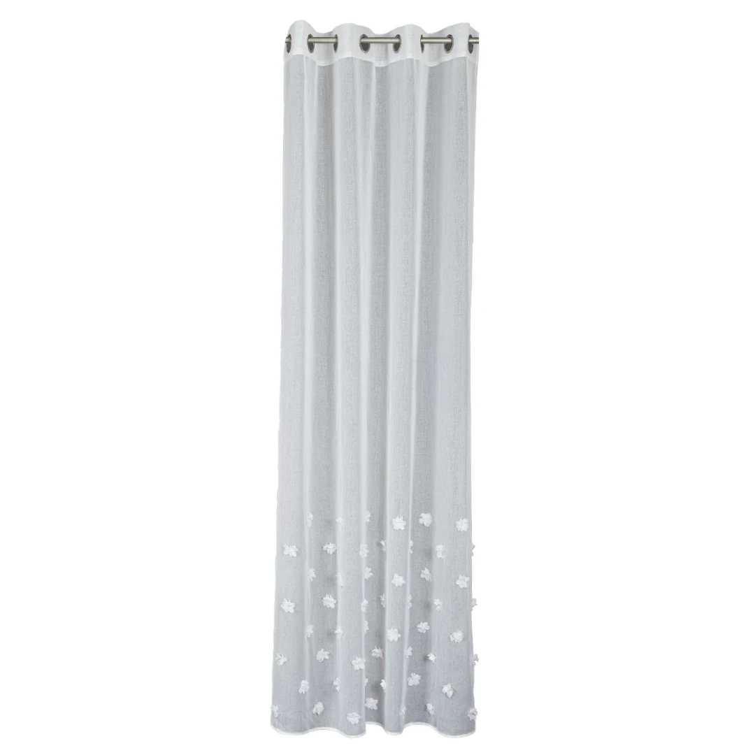 Hotová záclona vyrobená z bielej etaminy s jemnou, drobnou štruktúrou, zakončená olovenou páskou v spodnej časti. Zdobená efektným trojrozmerným vzorom kvetov umiestneným v dolnej časti tkaniny.