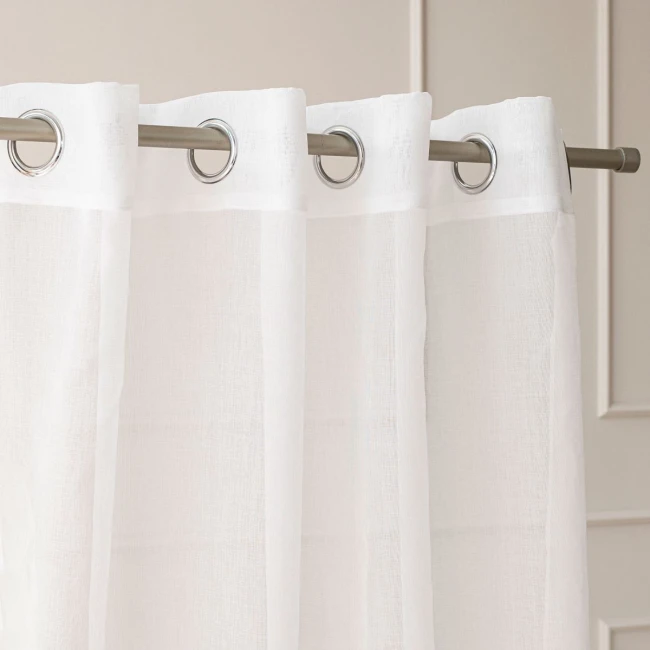 - Hladký voálový materiál je látka, ktorá sa najčastejšie volí na závesy v obývačke, izbe alebo spálni, kde dodáva interiéru ľahkosť a eleganciu, umožňuje súkromie a zároveň prepúšťa do miestnosti primerané množstvo denného svetla.