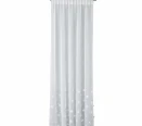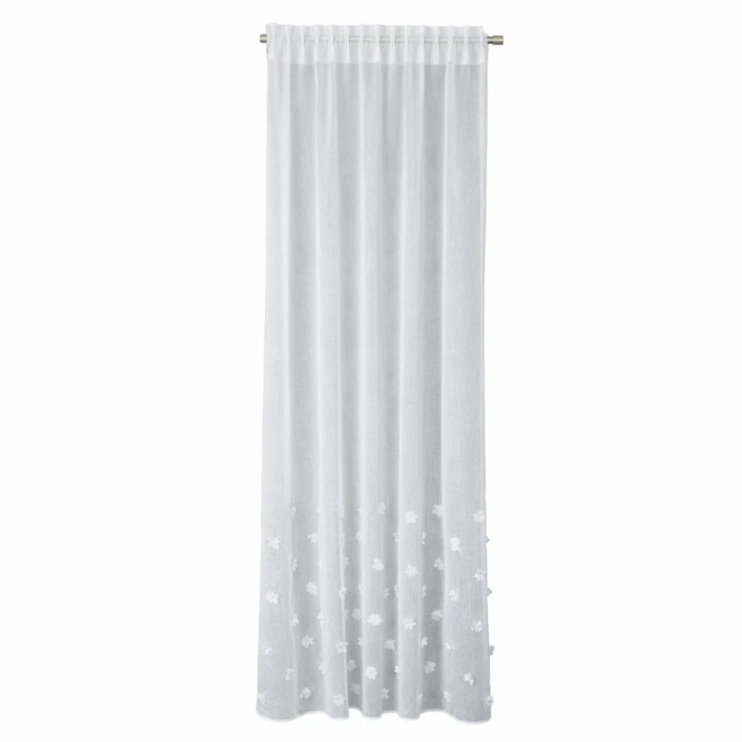 Hotová záclona vyrobená z bielej etaminy s jemnou, drobnou štruktúrou, zakončená olovenou páskou v spodnej časti. Zdobená efektným trojrozmerným vzorom kvetov umiestneným v dolnej časti tkaniny.