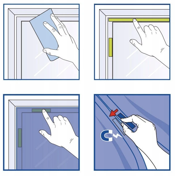2. Pripevnite popruhy na suchý zips k rámu dverí: Na horný rám okna nalepte rovnomerne 100 cm suchého zipsu a jednotlivé suché zipsy nalepte na pravú a ľavú stranu zárubní.