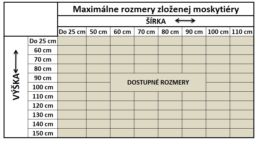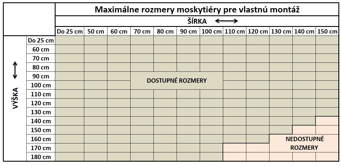 Maximálna veľkosť moskytiéry závisí od zvoleného typu montáže (zloženej alebo na samostatnú montáž). Podrobnosti v záložke Technické informácie.