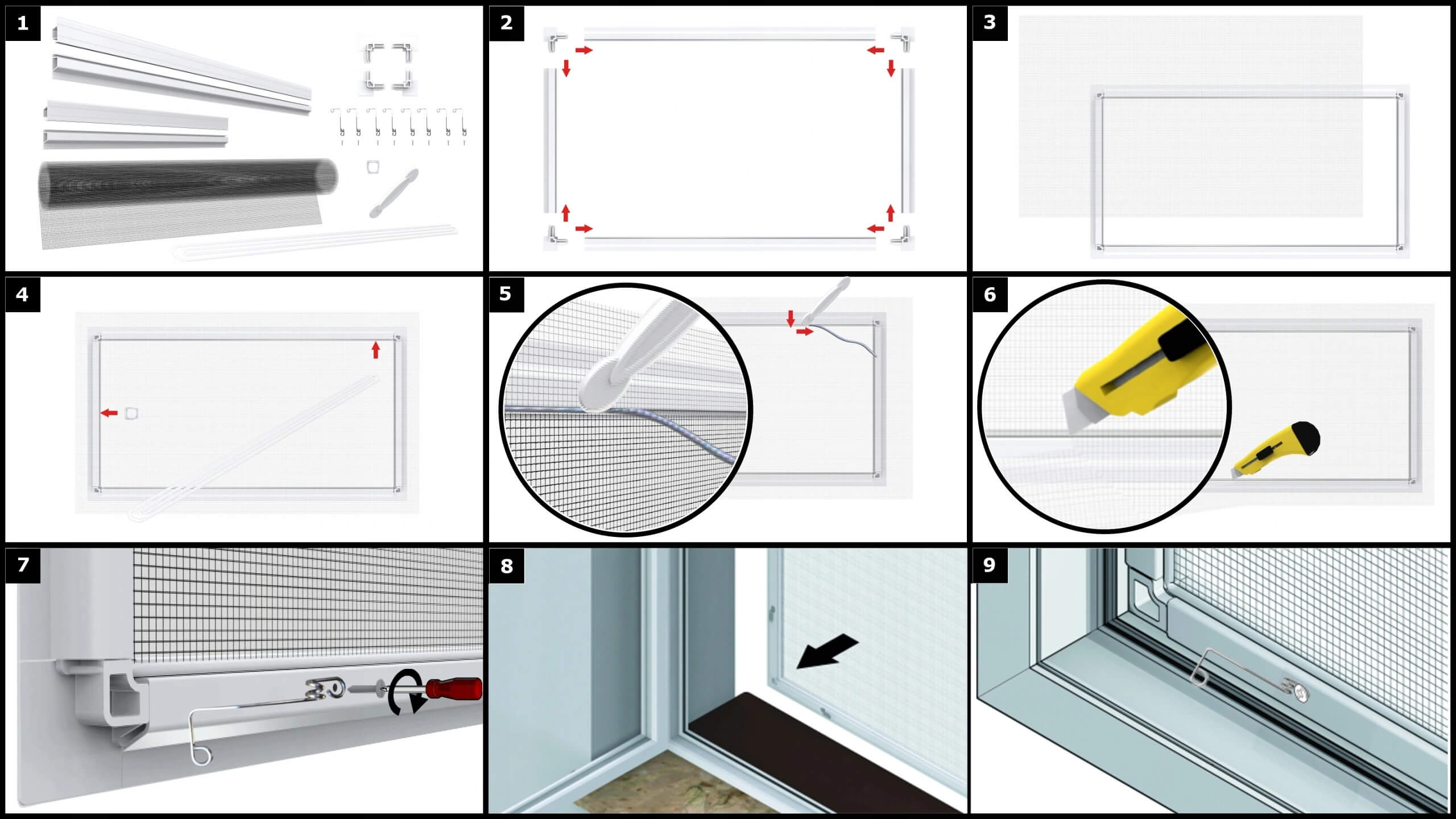 - Ak zvolíte možnosť "vlastná montáž", montáž moskytiéry prebieha v niekoľkých jednoduchých krokoch, jediné potrebné nástroje sú skrutkovač a nôž