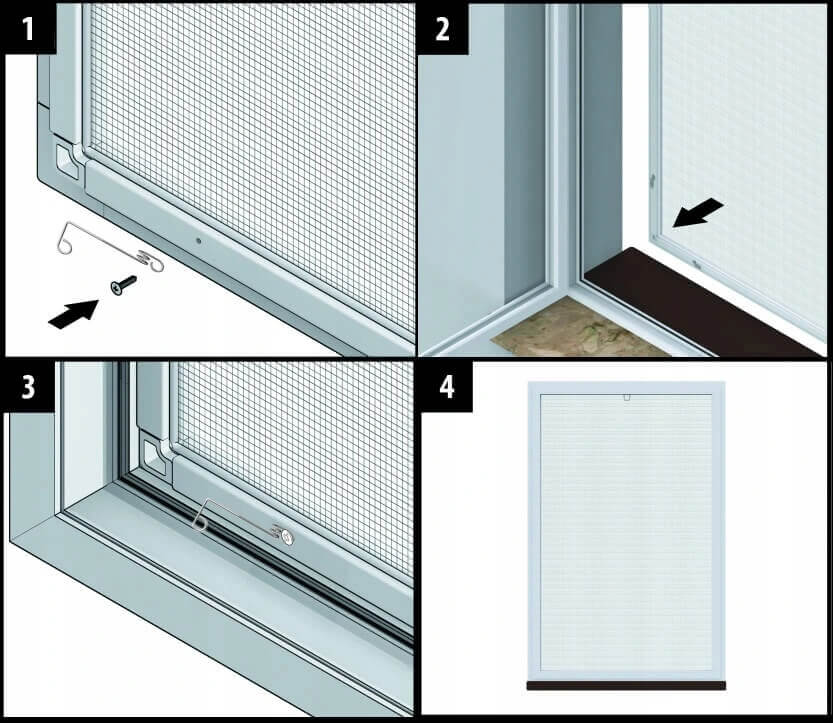- Montáž moskytiéry: neinvazívna (bez vŕtania, s použitím priložených univerzálnych odpružených držiakov vyrobených z nehrdzavejúcej ocele), aby ste si zachovali záruku na okno