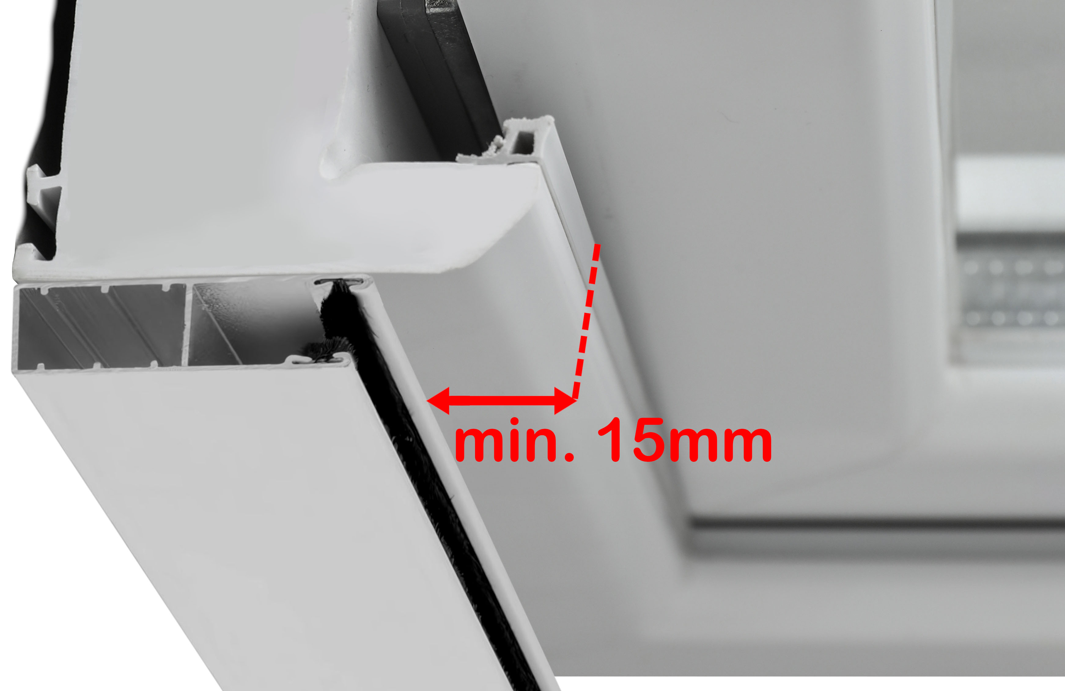 Ak máte namontované vonkajšie rolety, sieť proti komárom môžete namontovať len vtedy, ak sú vodiace lišty vonkajších roliet vzdialené minimálne 15 mm od konštrukcie okna.