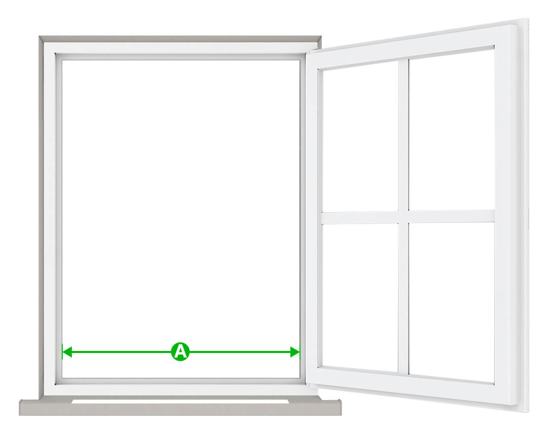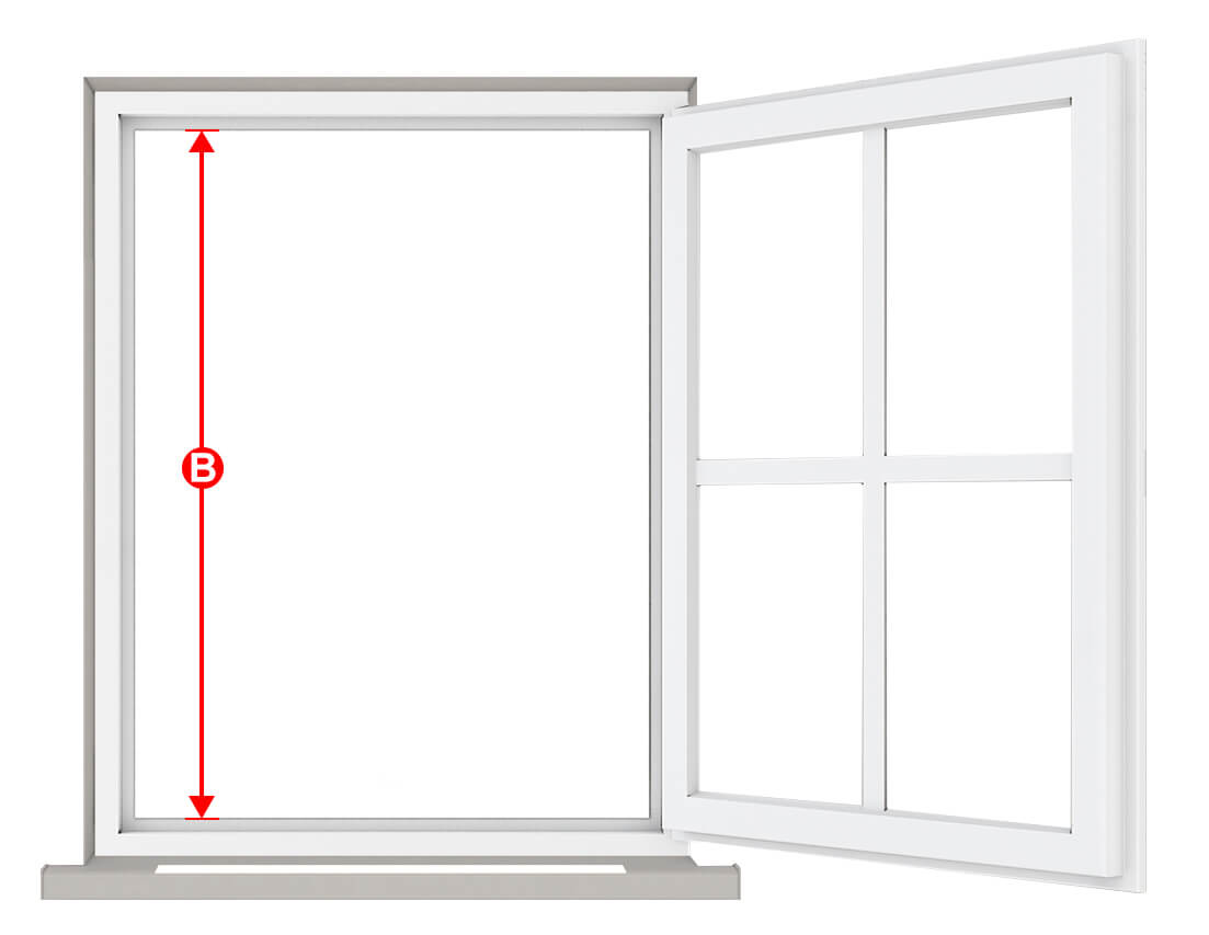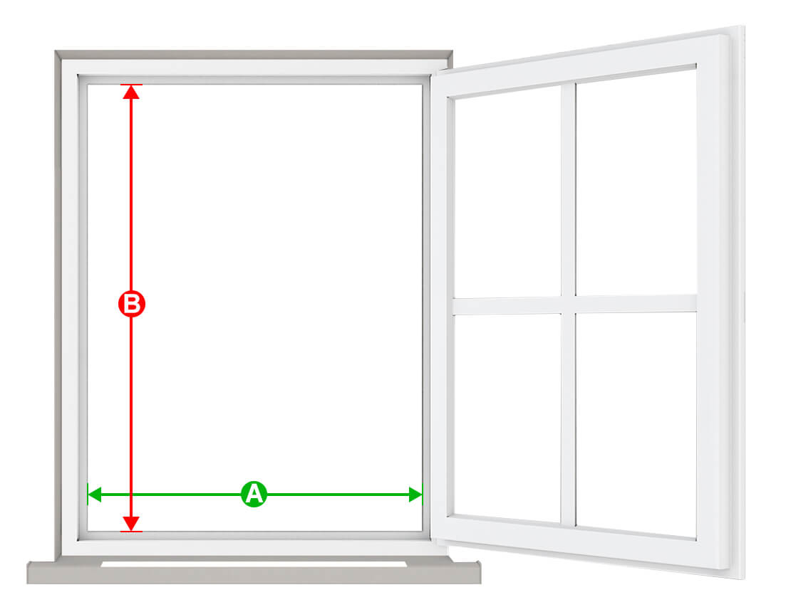 Po otvorení okna zmeriame šírku ''A'' a výšku ''B'' (vzdialenosť medzi najviac vyčnievajúcimi bodmi v ráme okna).