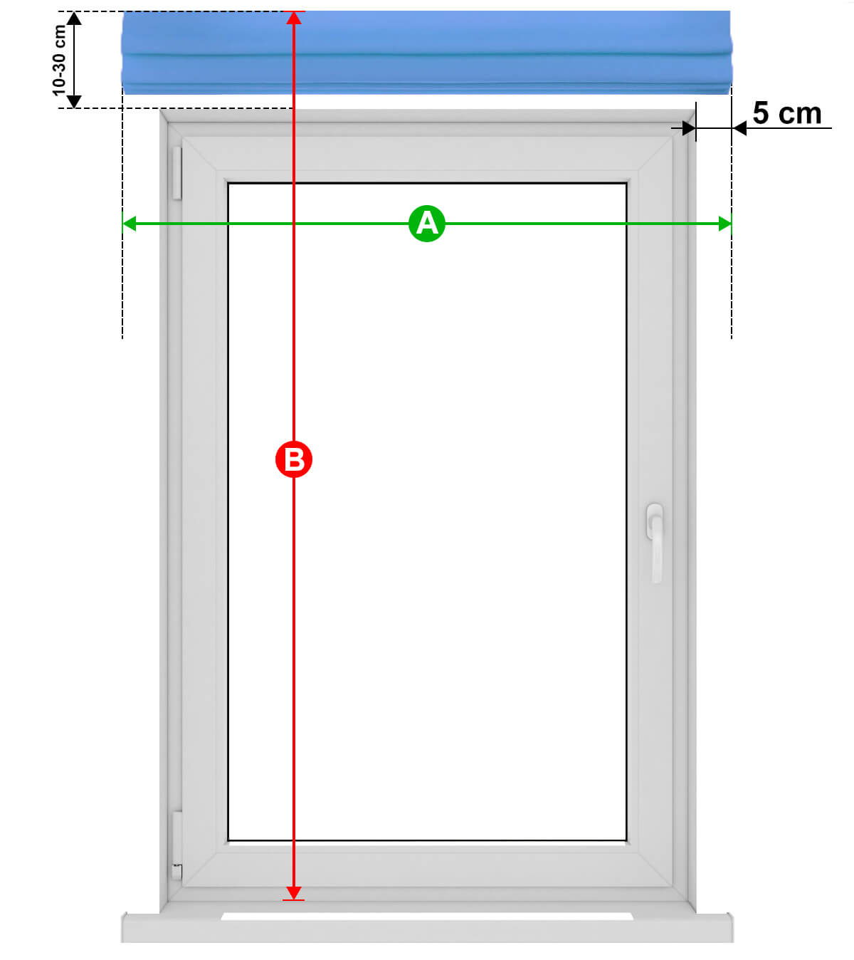 Definujete tu šírku látky. Odporúčame, aby bola širšia ako je výklenok okna (otvor v stene) o 10 cm (5 cm na každej strane). Roleta však môže byť aj širšia alebo užšia ako odporúčaných + 10 cm - je to vec individuálnych preferencií, ale nesmie byť menej ako 2 cm z každej strany (aby sa zabránilo prenikaniu svetla do miestnosti).