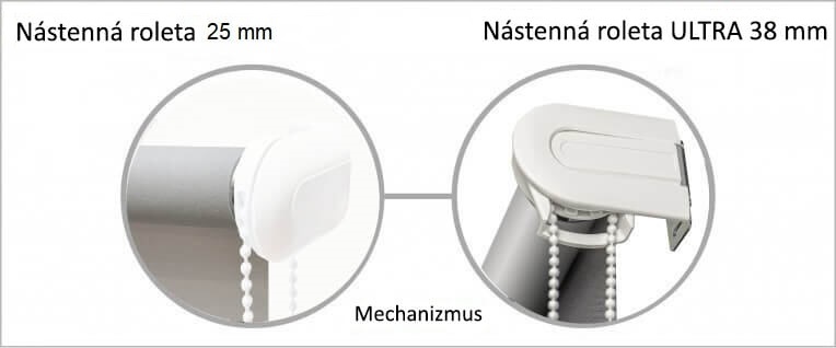 Nástenná roleta ULTRA 38 mm sa okrem nižšie uvedenej vizuálnej stránky líši od nástennej rolety 25 mm tým, že má hrubšiu rúrku a kovový mechanizmus, vďaka ktorému dokážeme vyrobiť širšie rolety.