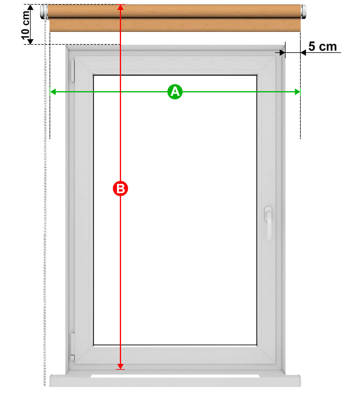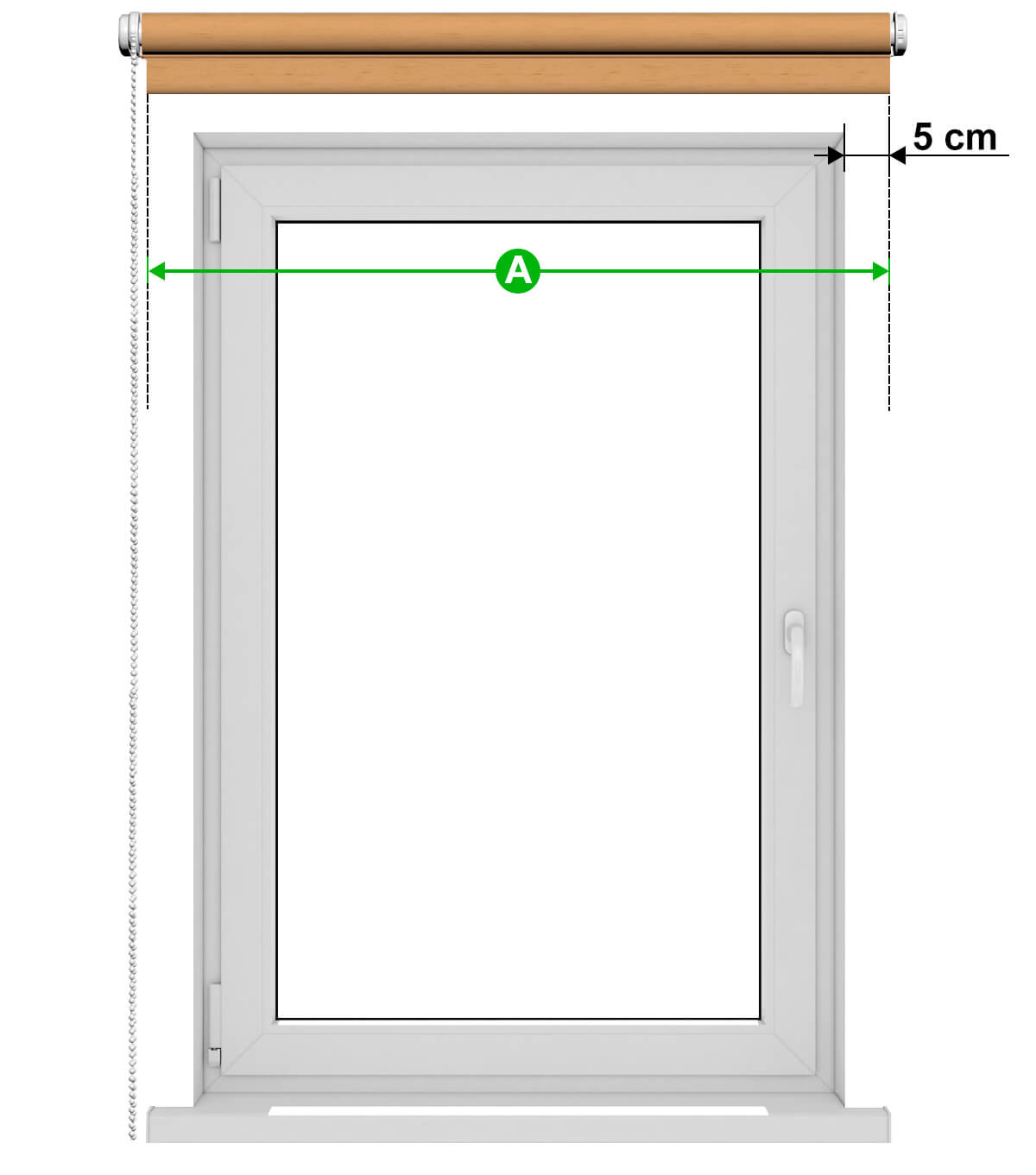 Zadáte šírku materiálu. Navrhujeme, aby bol širší ako výklenok okna (otvor v stene) o 10 cm (5 cm na každej strane). Ak chcete, aby bola roleta širšia alebo užšia ako odporúčaných 10 cm, nič tomu nebráni - je to záležitosť individuálnych preferencií (nesmie však byť na každej strane menšia ako 2 cm, aby svetlo neprenikalo do miestnosti).