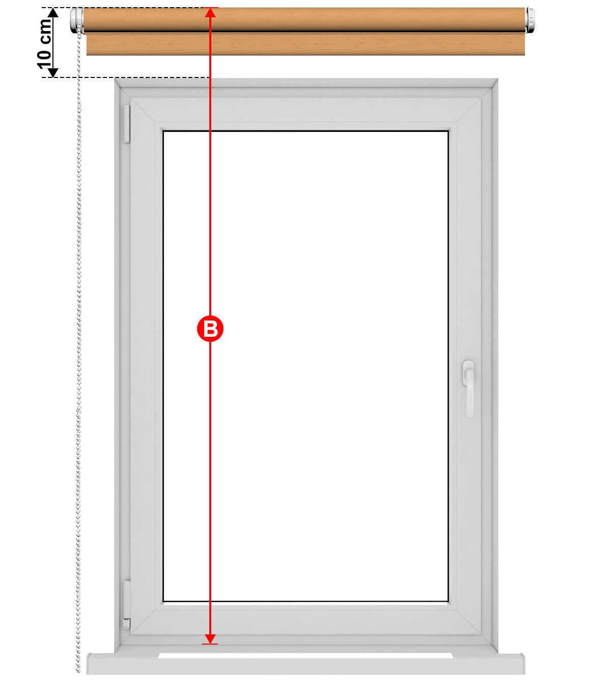 Zmerajte výšku výklenku okna a pridajte 10 cm (pretože roleta musí byť namontovaná 10 cm nad výklenkom). Ak získaná hodnota nepresahuje 170 cm, zadajte výšku "B" rovnú 170 cm. Ak je získaná hodnota väčšia ako 170 cm, zadajte výšku "B" rovnajúcu sa 240 cm.