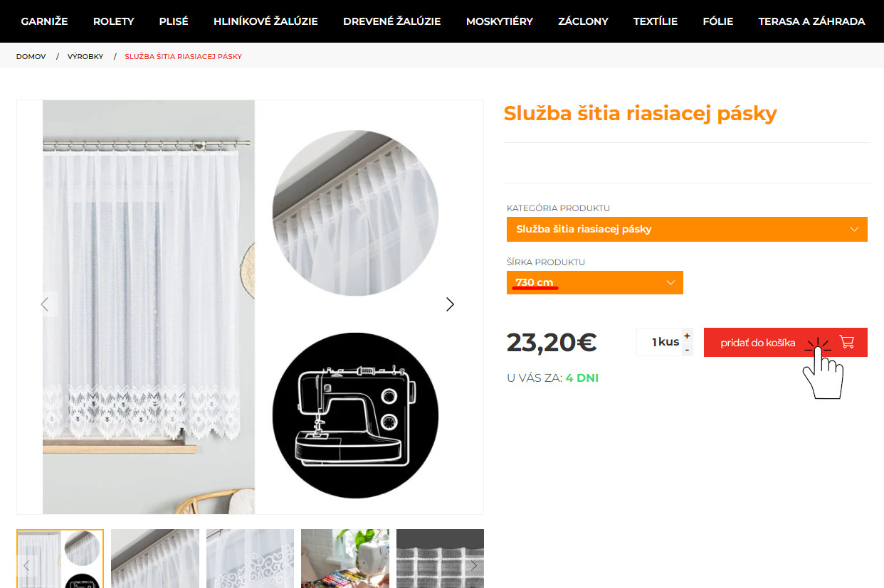 2. do poľa „ŠÍRKA VÝROBKU“ zadajte súčet šírok všetkých záclon, na ktoré chceme ušiť pásku, a pridajte službu šitia riasiacich pások do košíka (spočítajte šírky všetkých záclon a výsledok zadajte do poľa „ŠÍRKA VÝROBKU“).
