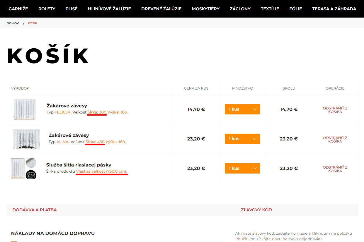 3. Prejdite do košíka a uistite sa, že súčet šírok záclon zodpovedá šírke šijacej služby.