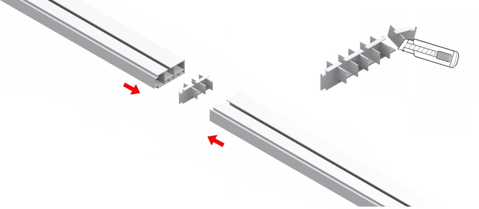 - Konektor by mal byť zrezaný samostatne na jednodrážkové a dvojdrážkové koľajničky, zatiaľ čo do trojdrážkovej koľajničky sa namontuje v celosti