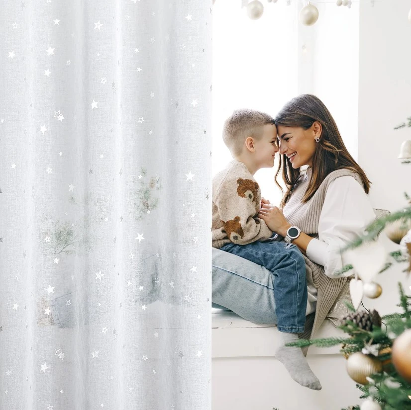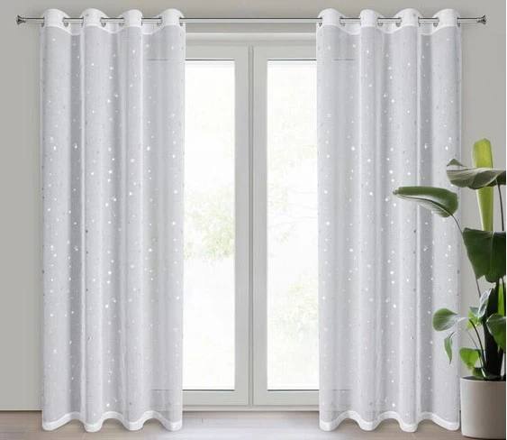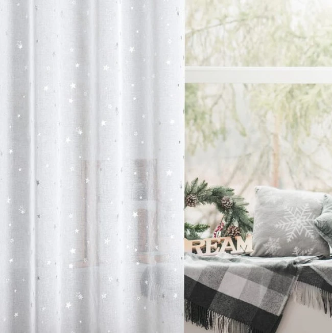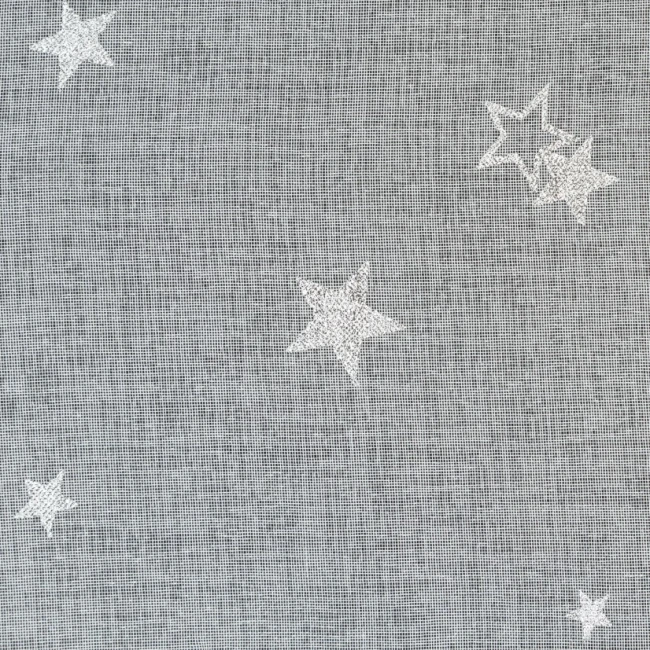 Hotová záclona vyrobená z bielej etaminy s jemnou, drobnou štruktúrou, zakončená olovenou páskou v spodnej časti. Zdobená efektnými striebornými mašľami s trblietavými kamienkami. Jemné zdobenie jej dodáva výnimočný charakter.