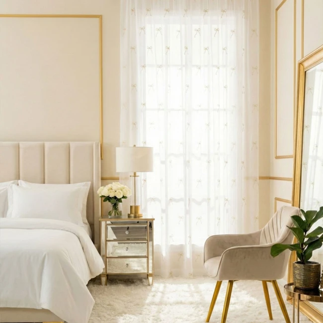 - Hladký voálový materiál je látka, ktorá sa najčastejšie volí na závesy v obývačke, izbe alebo spálni, kde dodáva interiéru ľahkosť a eleganciu, umožňuje súkromie a zároveň prepúšťa do miestnosti primerané množstvo denného svetla.