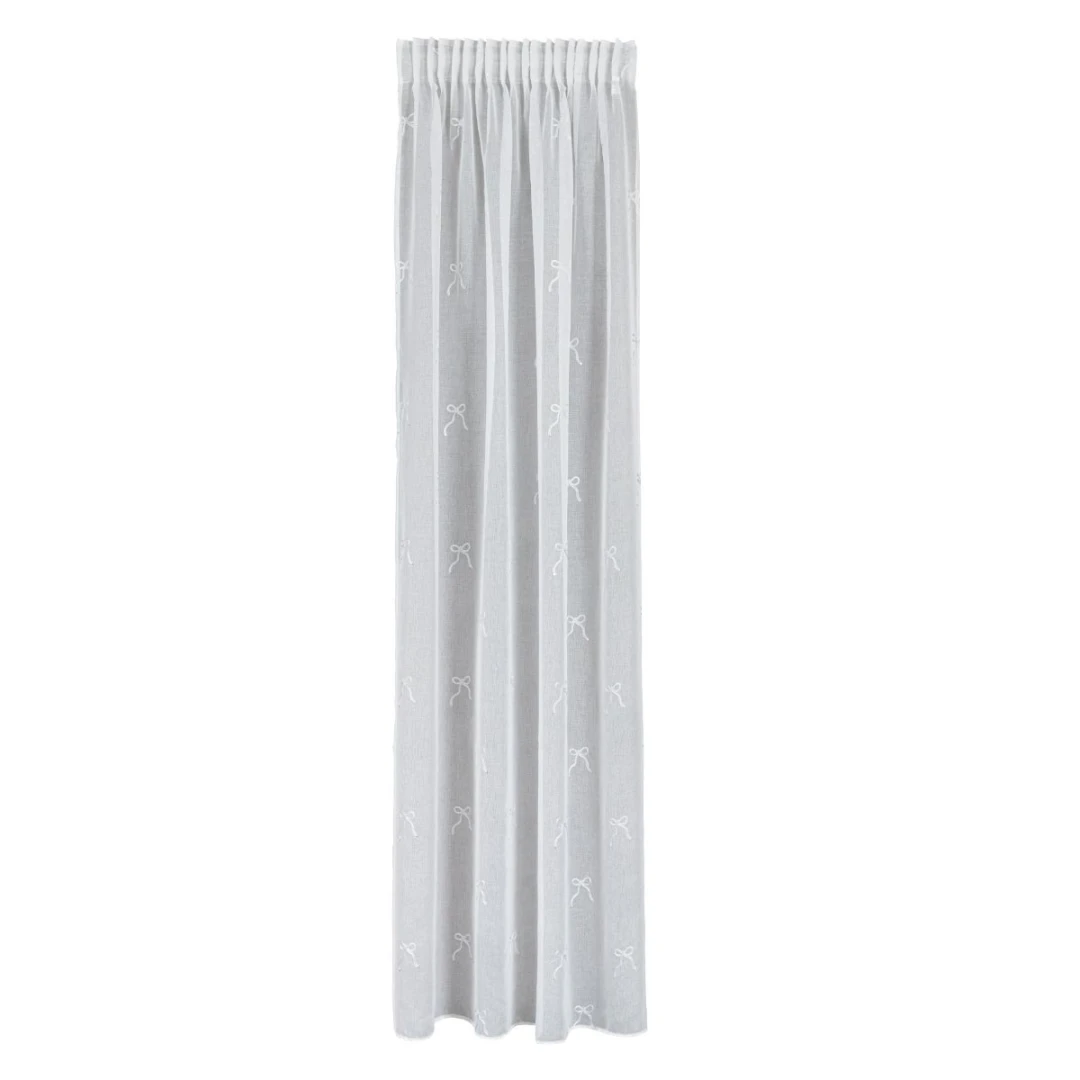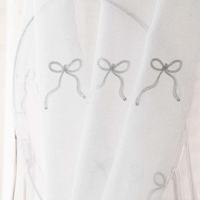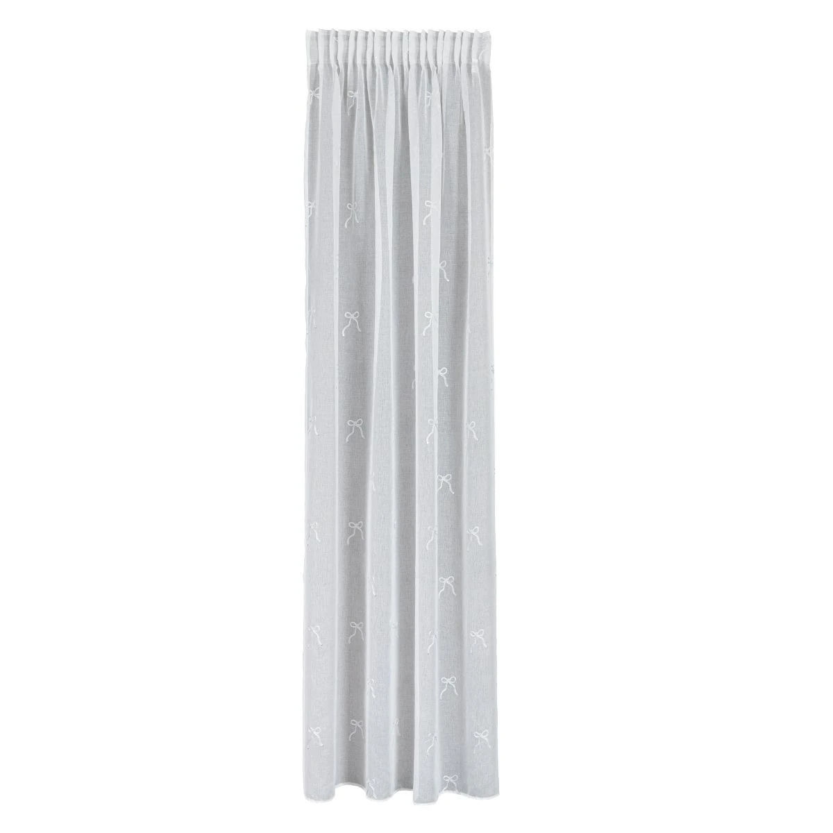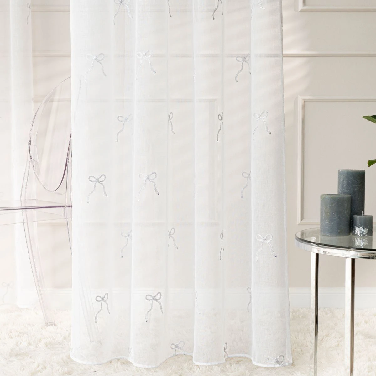 Hotová záclona vyrobená z bielej etaminy s jemnou, drobnou štruktúrou, zakončená olovenou páskou v spodnej časti. Zdobená efektnými striebornými mašľami s trblietavými kamienkami. Jemné zdobenie jej dodáva výnimočný charakter.