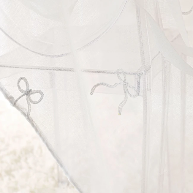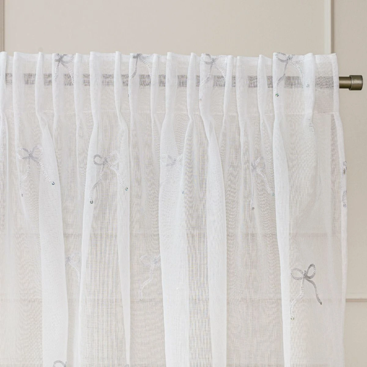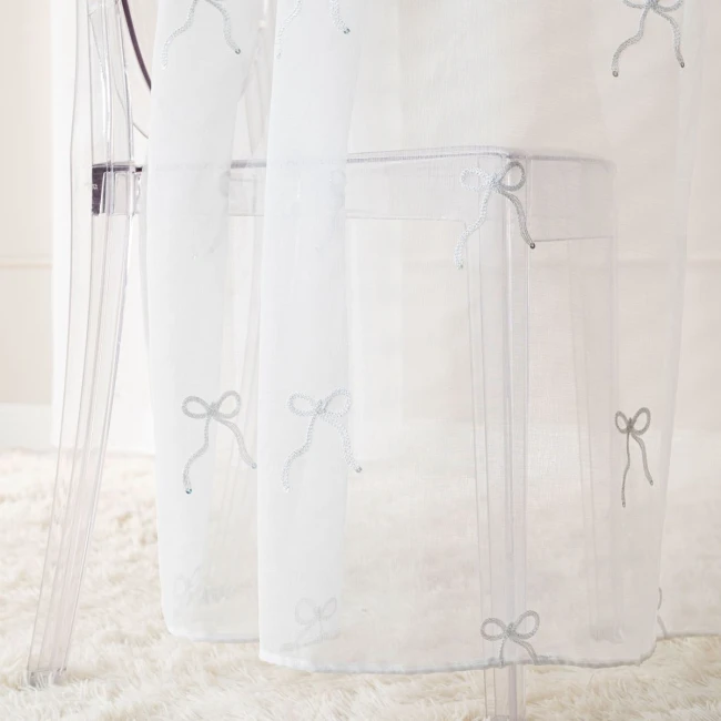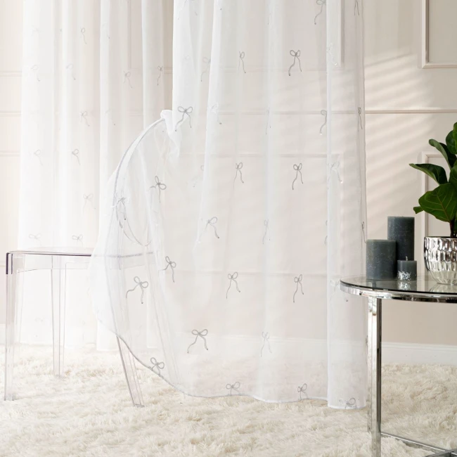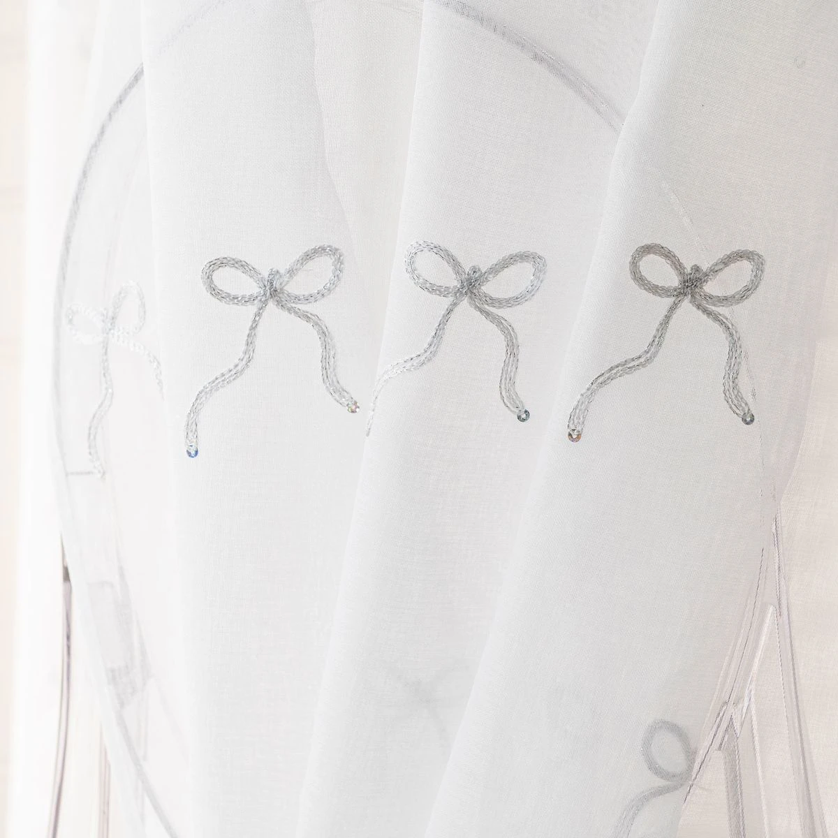 Hotová záclona vyrobená z bielej etaminy s jemnou, drobnou štruktúrou, zakončená olovenou páskou v spodnej časti. Zdobená efektnými striebornými mašľami s trblietavými kamienkami. Jemné zdobenie jej dodáva výnimočný charakter.