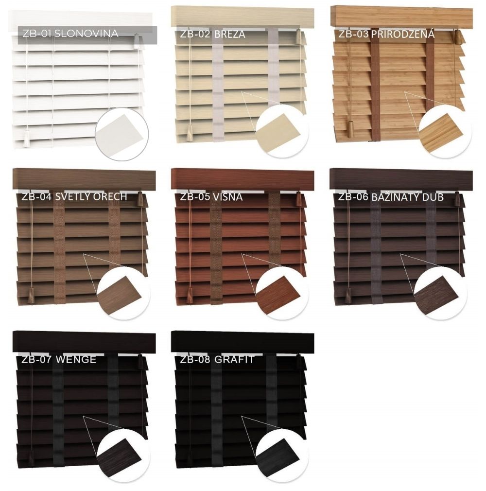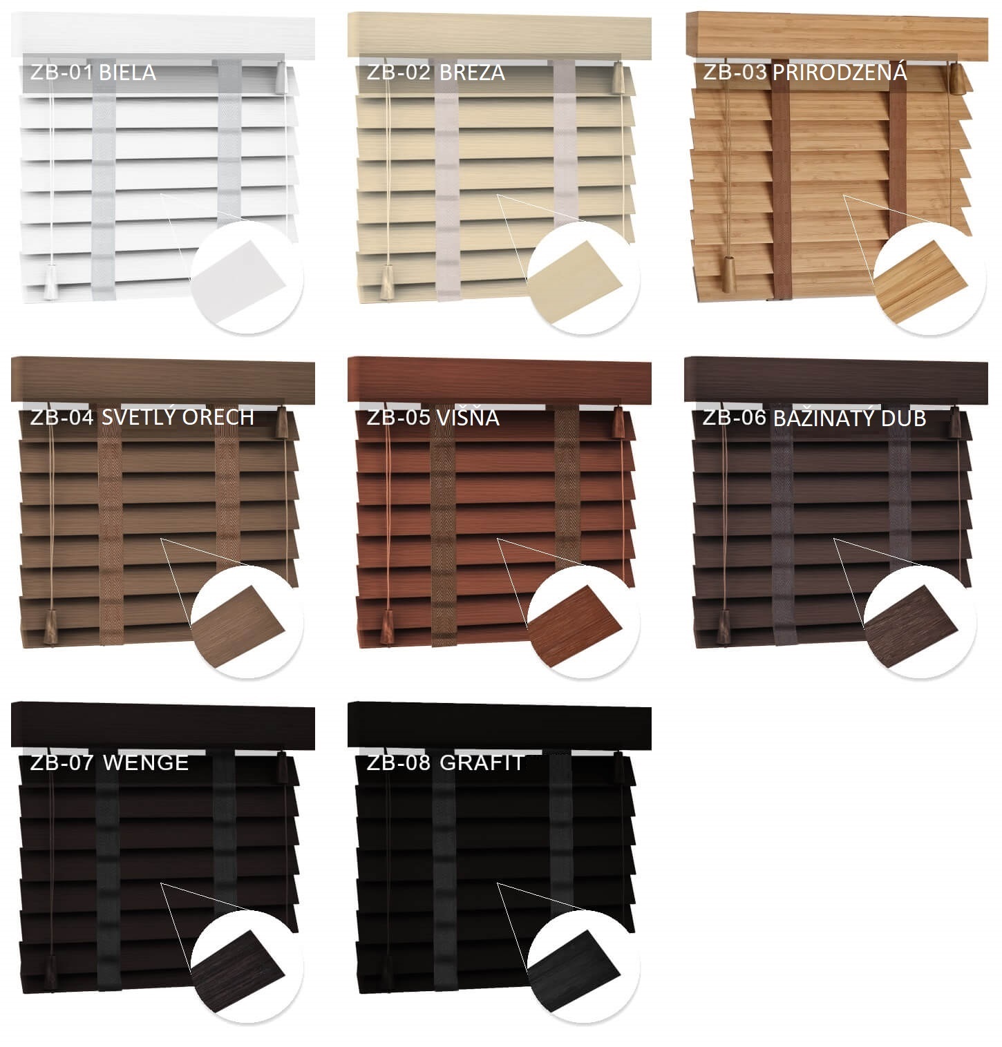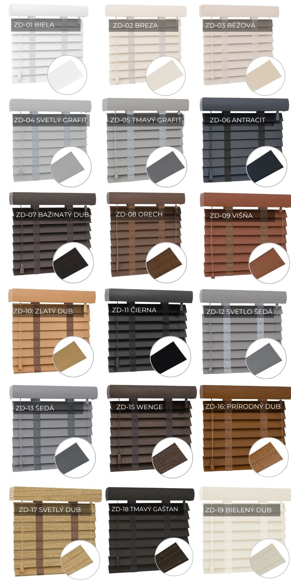 Nie je potrebné objednávať celú paletu, iba farbu alebo farby, ktoré vám vyhovujú. Tu si môžete objednať lamelové farby, ktoré používame na 25 mm a 50 mm drevenú/ bambusovú roletu.